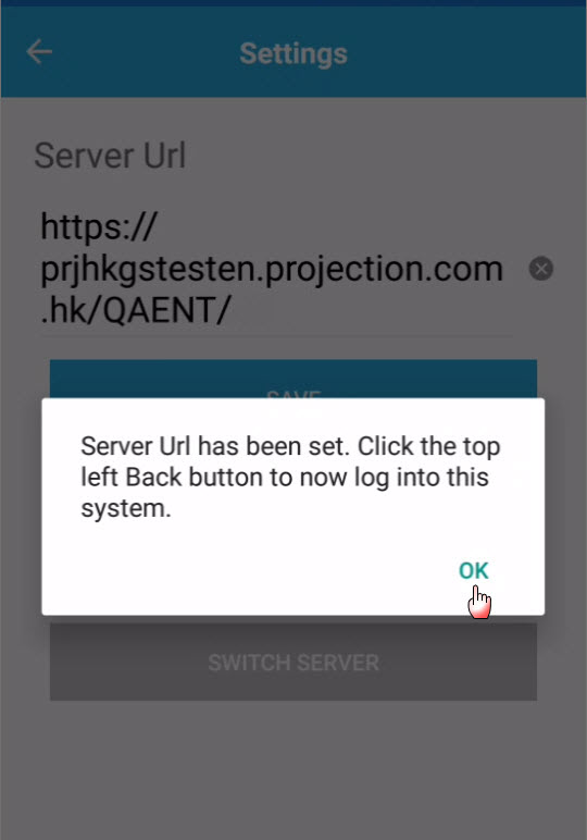 Open the iOS or Android browser and enter the URL path for the application. Alternatively, you can scan the provided QR Code to automatically display the URL path. Click OK on the Server URL pop-up message. |